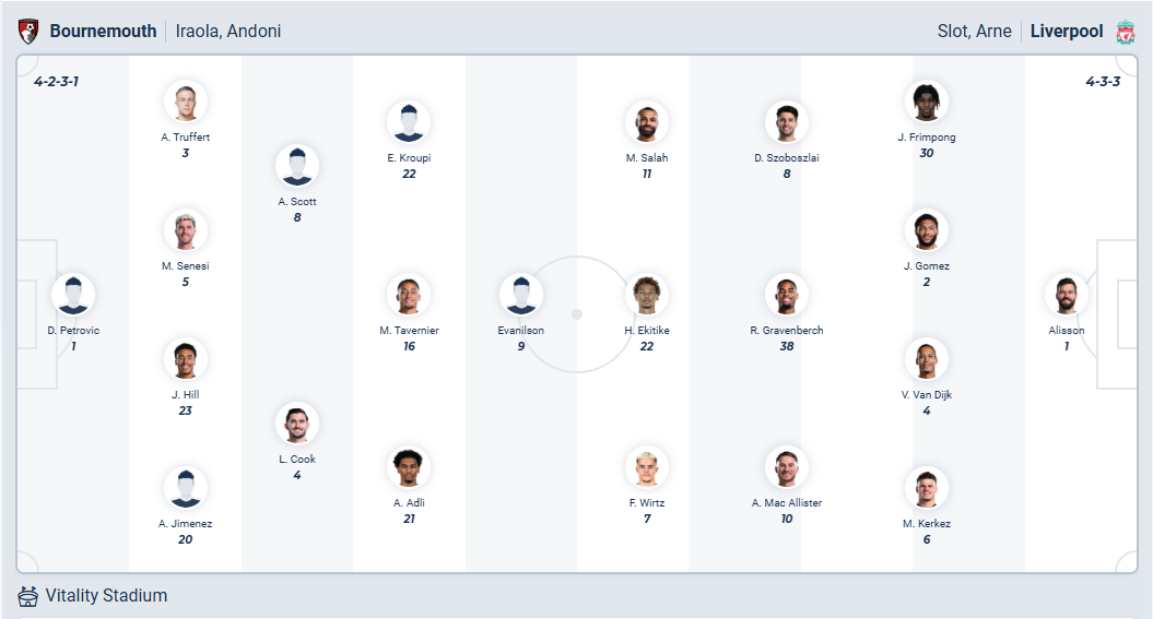 Liverpool hòa 4 trận liên tiếp tại Premier League, chuỗi trận để lại khá nhiều tiếc nuối và khiến các fan không hài lòng xen lẫn giận dữ. Dù vậy chiến thắng thuyết phục tại Champions League vừa qua đã khiến tinh thần của các cầu thủ Liverpool tốt hơn rất nhiều và HLV Arne Slot cũng ít áp lực hơn. Điều đội bóng vùng Merseyside cần làm là tiếp tục giành chiến thắng để giữ vị trí của mình trong top 4, đến làm khách trên sân của một Bournemouth không có phong độ cao là cơ hội tốt cho Liverpool thực hiện mục tiêu và nhiều khả năng họ sẽ ra về với 3 điểm trọn vẹn.